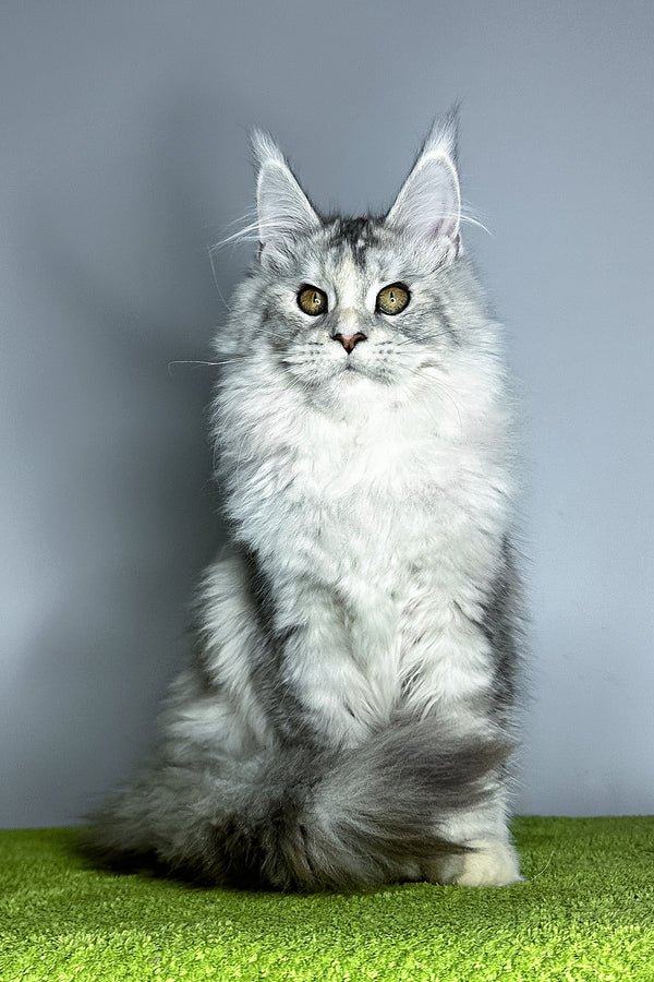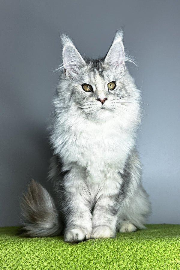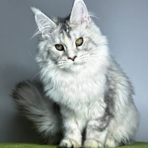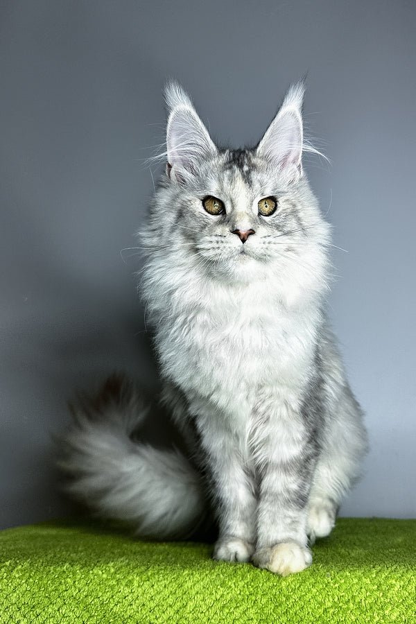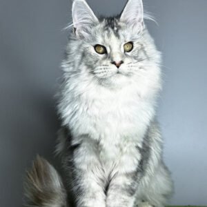 Hi, I’m Vanilla a Maine Coon girl in black tortoise silver ticked tabby with warm hazel eyes. My coat is a painterly blend of silver with soft tortie accents that shimmer when I move, and I carry myself with that classic Maine Coon poise: long tail, well-set ears, and a calm, attentive gaze. I’m gentle, observant, and affectionate happy to chase a feather in playful bursts, then settle nearby to keep you company. I eat Savory (holistic), which keeps my energy smooth and my coat plush for our brushing sessions (I purr the whole time).